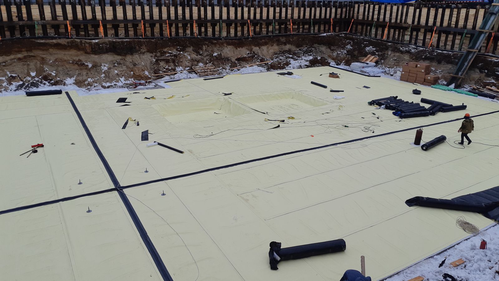 Вакуумная система гидроизоляции представляет собой конструкцию, состоящую из двух слоев полимерной мембраны площадью до 150 м2. Оба слоя мембраны свариваются в карты с использованием стандартного контроля качества и создания избыточного давления в полости двойного шва. Затем к верхнему слою мембраны герметично привариваются инъекторы (штуцеры) всего на одну карту приходится от 2 до 5 инъекторов (штуцеров) в зависимости от площади и геометрии, к которым подключаются промаркированные трубки, магистраль которых прокладывается в арматурном каркасе, вбитом в бетон.